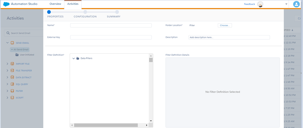 Filter Activity: Filter Activity is used to filter data according to the filters defined in Email Studio. We need to first create a data filter in Email Studio and then use that filter to configure it in the Automation Filter activity.