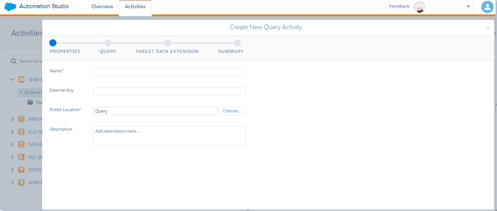SQL Query Activity: This activity runs just like SQL. If we want to get or filter data from another data extension and want to save the data in another data extension then we use SQL query activity.