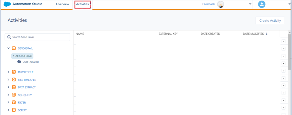 Actions: Activities are the actions that we have configured in Automation Studio as per our requirement. All activities whether they are being used in automation or not reside here.