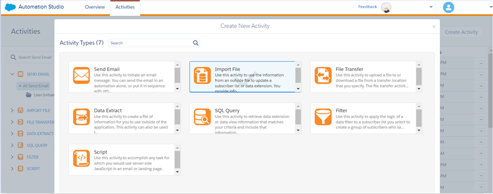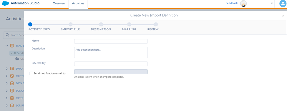 Import Activity: For importing data from any other source like FTP, Salesforce reports, etc., then this activity is not used. We can import data into data extension using import activity.