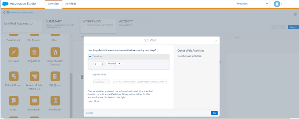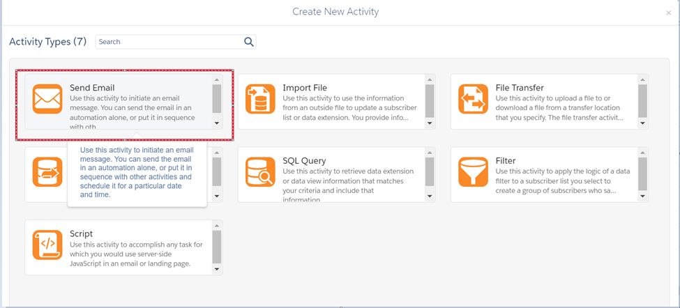 Salesforce send email activity: This is similar to email send activity but instead of sending an email to the audience present in the standard data extension folder, it is used to send an email to the salesforce data extension.