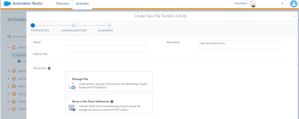 File Transfer Activity: We can use File Transfer Activity to move a file from Marketing Cloud to another location. We can use this activity when we want to transfer, unzip, encrypt or decrypt a file.