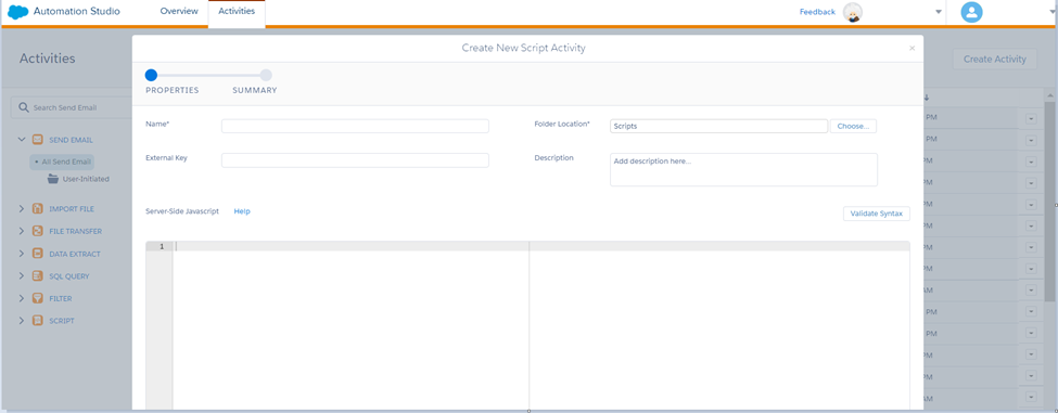 Script Activity: Script Activity is used to execute server-side JavaScript in the salesforce marketing cloud. We primarily use Script Activity when we want to host and run resources for cloud landing pages.