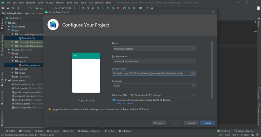 If you are starting a new project, your users want a name for the app from which they will know your identity, so it is necessary to put an appropriate app name and other required details in this step. You also have to select a language for the development of the app Java or Kotlin( preferably Kotlin). Select the lowest version of Android that your app can support in the Minimum SDK field.