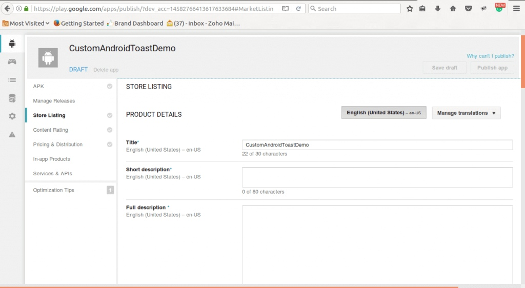 So this is the process in which you have to mention all the details that are required by the platform related to the application. Here is the screenshot of the details that you will have to fill in. Also, ensure to put the appropriate keywords of your app as it will increase the chances of your app showing up in the searches.