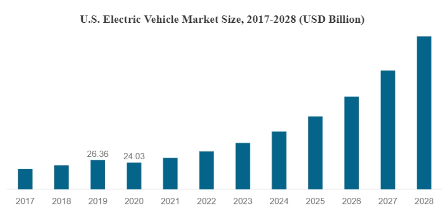 - According to Fortune Business Insights, the US electric vehicle market was worth USD 24.03 billion in 2020 and is expected to be worth USD 137.43 billion by 2028.