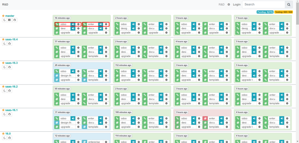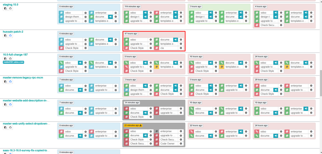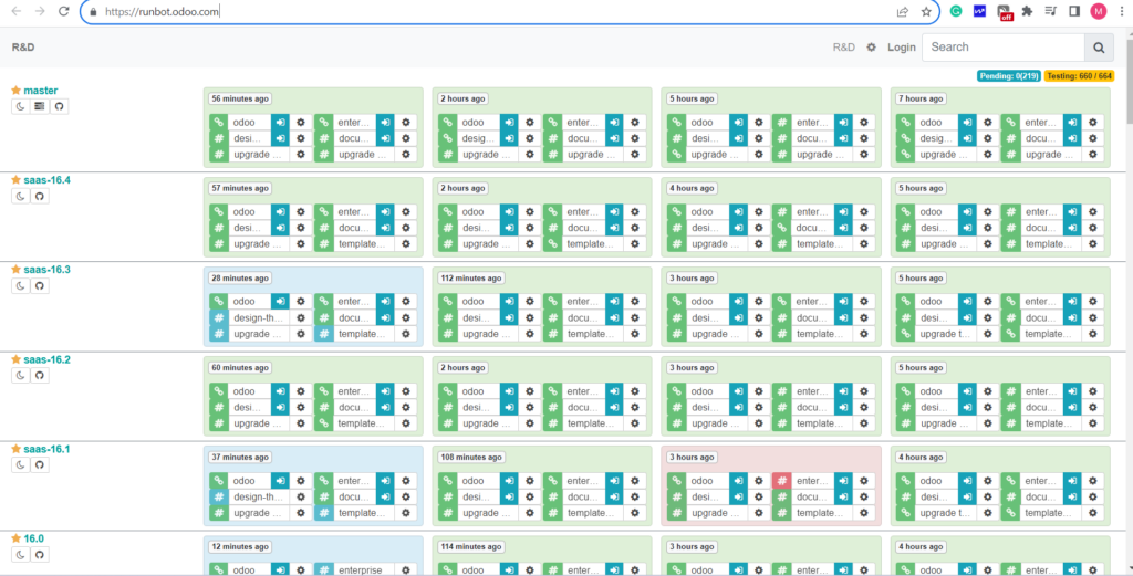 - Visual Indicators: On the Runbot dashboard, builds are color-coded to easily identify their status. For example, green indicates a successful build, red indicates a failed build, and yellow means the tests are still running.