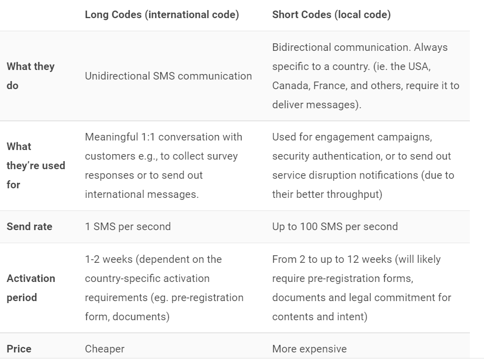 What do ‘long code’ and ‘short code’ mean? Here’s a comparison table, followed by a lengthy explanation: