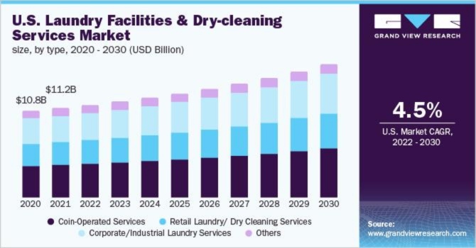 - The laundry industry market will be valued at $22.23 Billion in 2022. This valuation will increase to $187.76 Billion by 2030 (est.) The CAGR will grow at 30.6% between 2022-2030.